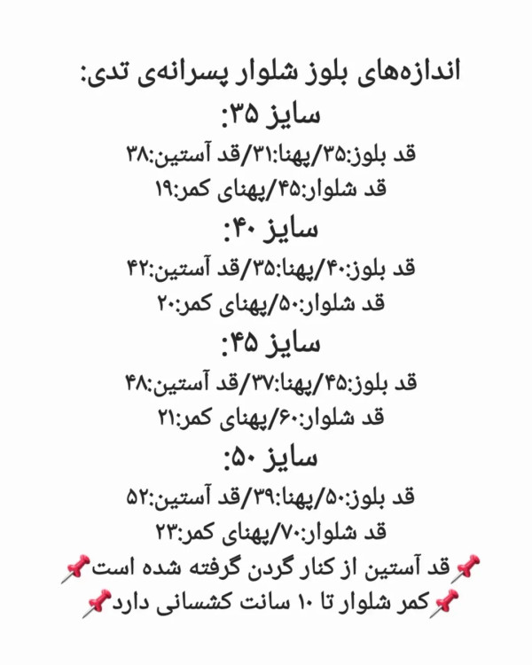 قد بلوز:۳۵/پهنا:۳۱/قد آستین:۳۸