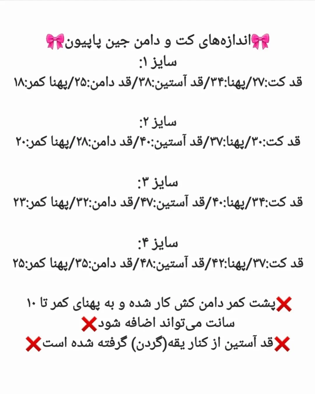 قد کت:۲۷/پهنا:۳۴/قد آستین:۳۸/قد دامن:۲۵/پهنا کمر:۱۸