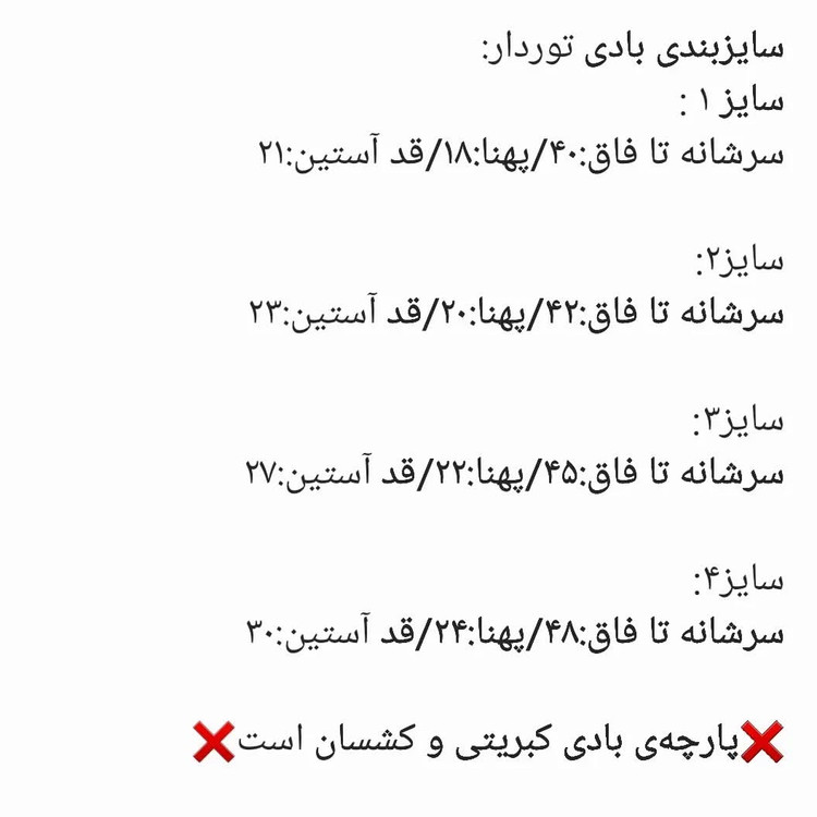 سرشانه تا فاق:۴۲/پهنا:۲۰/قد آستین:۲۳