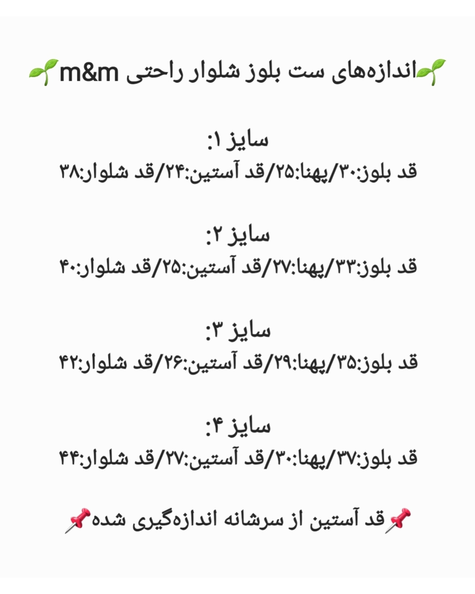 قد بلوز:۳۰/پهنا:۲۵/قد آستین:۲۴/قد شلوار:۳۸