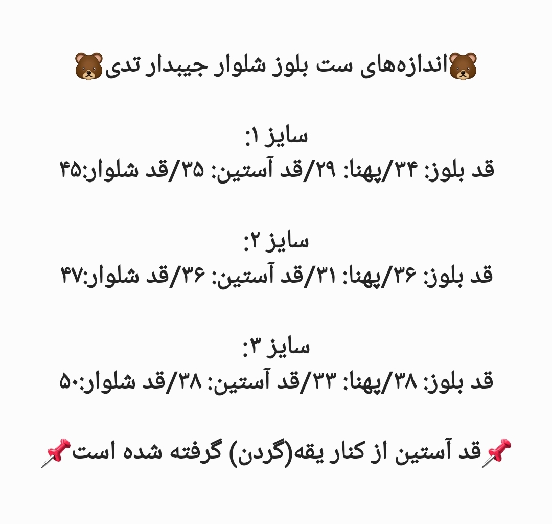 قد بلوز: ۳۴/پهنا: ۲۹/قد آستین: ۳۵/قد شلوار:۴۵