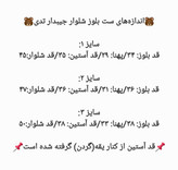 قد بلوز: ۳۶/پهنا: ۳۱/قد آستین: ۳۶/قد شلوار:۴۷