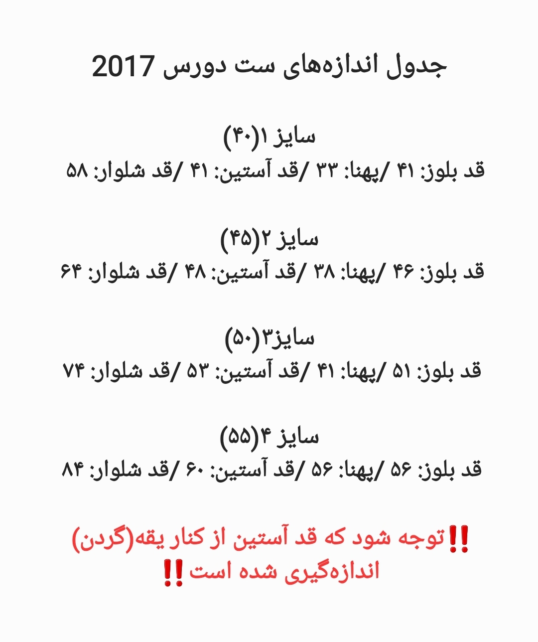 قد بلوز: ۴۱ /پهنا: ۳۳ /قد آستین: ۴۱ /قد شلوار: ۵۸