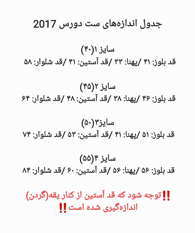 قد بلوز: ۴۶ /پهنا: ۳۸ /قد آستین: ۴۸ /قد شلوار: ۶۴